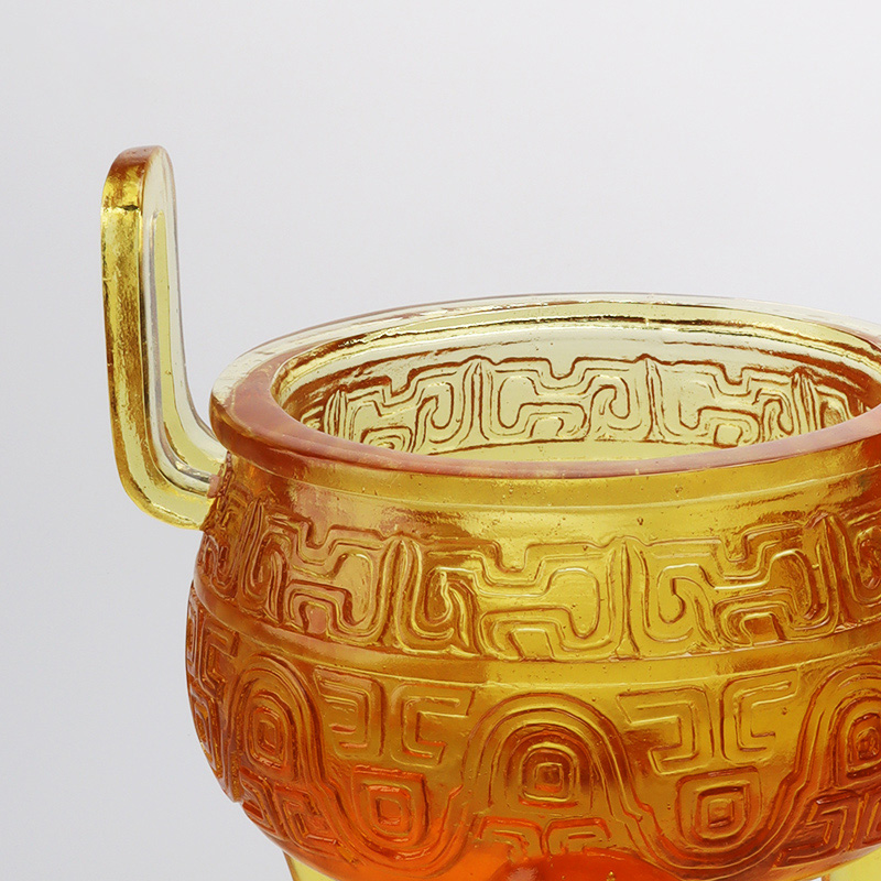 Designmässigt är formen på glasyrstativet högtidlig och enkel, vilket önskvärt replikerar den klassiska formen på det gamla stativet. Det finns utsökta sniderier på stativets kropp, öronen är naturligt böjda och linjerna på stativets kropp är känsliga och skiktade, som om de berättar en uråldrig historia. Den trebenta formen på stativet är unik och ger en stabil och stämningsfull hållning, och varje detalj visar hantverkarnas utsökta hantverk.